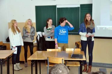 Der Tag begann früh um 7.00Uhr, weil, wie man ja weiß, „der frühe Vogel den Wurm fängt!“ Um 9.00 Uhr waren wir dann so weit, dass wir unsere Schulen vorstellen konnten, erst die Finnen, dann die Italiener und zuletzt waren wir dran. Danach ging es ans Auswerten der Diagramme zu den Ergebnissen unseres Fragebogens, den wir in Deutschland erarbeitet hatten. Wir erfuhren viel über die Gemeinsamkeiten und Unterschiede in der Freizeitgestaltung unserer Freunde aus den verschiedenen Partnerländern. Anschließend gab es Lunch und dann stellten wir die interessantesten Ergebnisse auf Postern dar, die wir kreativ gestalteten. Unsere anschließende Freizeit verbrachten wir nach Lust und Laune. Manche gingen shoppen, andere schickten Briefe an die Liebsten und einige "chillten“ einfach nur. Abends gab es dann einen kleinen Elternabend in der Turnhalle der Schule mit Sing-Einlagen aller vertretenen Ländergruppen und einem besonderem Special, dem Auftritt der Schülerband! Es war eine klasse Show, die die Schüler ablieferten und es gab eine Menge Applaus. Dann wurde das Buffet eröffnet. Jedes Land hatte landestypische Speisen mitgebracht. Nach dem Essen konnten alle je nach Belieben das Tanzbein schwingen! Man kann an dieser Stelle nur betonen, dass alles zu unserer vollsten Zufriedenheit geplant wurde. Später im Verlaufe des weiteren Abends verabredeten wir uns in unserem Stammlokal, dem „Warka“. Wir schauten Fußball und unterhielten uns mit unseren Comeniusfreunden. Es war alles in allem ein schöner Abend.