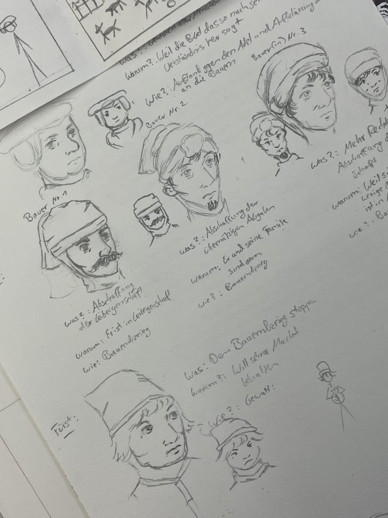 All das und weitere individuelle Aspekte bewegten eine Woche lang die Projektgruppe „Die gezeichnete Revolution – 500 Jahre Thomas Müntzer“ . Lernende informierten sich über Zeitgeschichtliches rund um Müntzer und erprobten sich im Gestalten von Comics. Die fachkundige Anleitung dazu gab der freischaffende Künstler und Comic-Zeichner Viktor Ludvik. Auch ein Besuch der aktuellen Ausstellung im Landesmuseum für Vorgeschichte ergänzte das historische Wissen eines jeden.