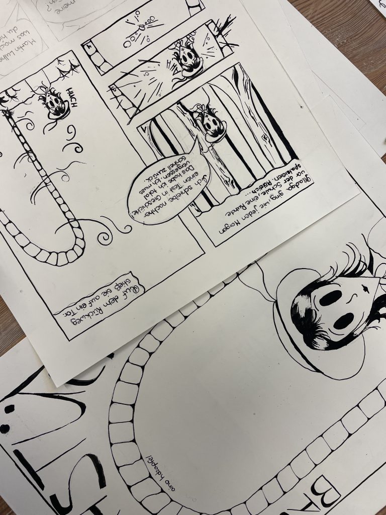Was dann aber eine bildnerische Story werden konnte, entschied jeder für sich, so dass als erstes das Storyboard entworfen wurde. Charaktertypen wurden zeichnerisch festgehalten, die Panels entsprechend entworfen. Am Ende gestaltete jeder ein vierseitiges, großformatiges Comic mit Feder-Tusche im A3- Format, was sich sehen lassen kann.