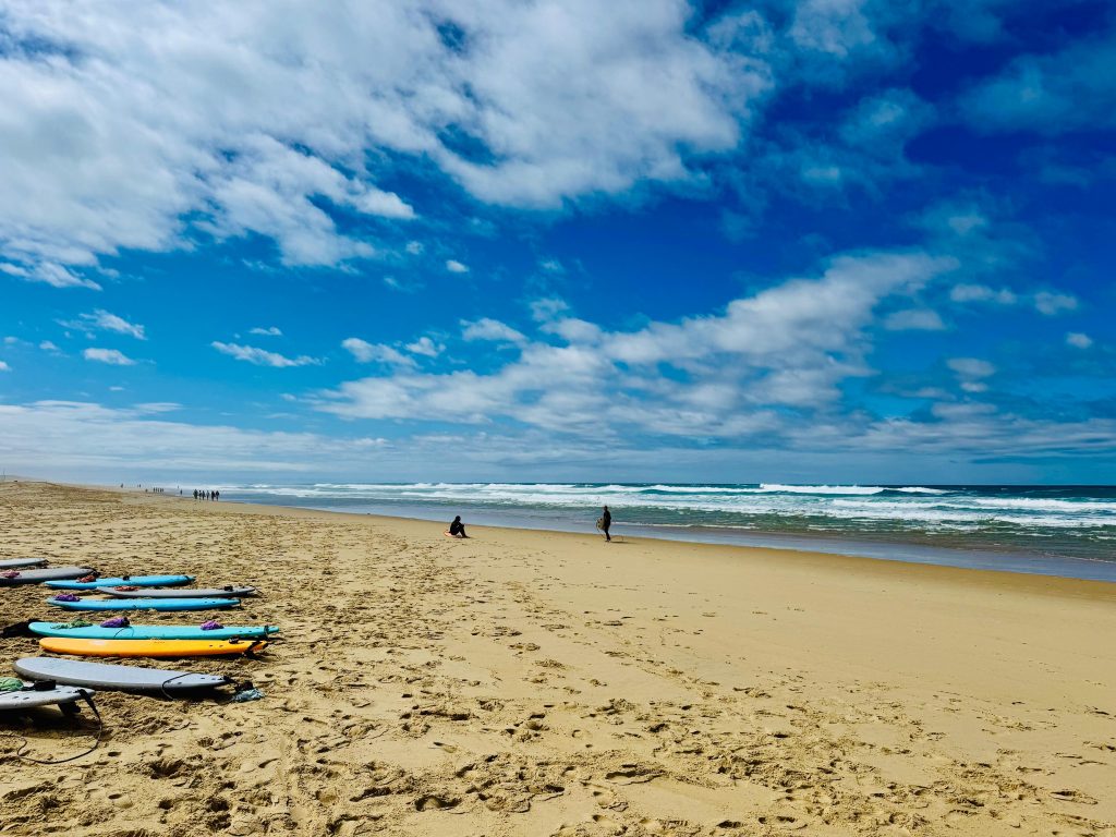 Nach einer langen, lustigen, aber auch anstrengenden Fahrt mit einem Zwischenstopp bei McDonald’s kamen wir schließlich morgens um 7:30 Uhr im Surfcamp an. Draußen war es noch stockdunkel, fast so, als wäre es mitten in der Nacht – wir konnten kaum glauben, dass wir schon da waren. In unsere Zelte durften wir jedoch erst ab 14 Uhr einziehen. Also machten wir uns direkt auf, die Gegend zu erkunden. Nur sieben Minuten vom Camp entfernt entdeckten wir die Promenade – eine moderne, breite Flaniermeile mit Restaurants, Supermärkten, Souvenirshops, Surfshops und allem, was man sich vorstellen kann. In der Mitte gab es sogar Spielplätze und Calisthenics-Parks, rundherum grün bepflanzt und eingerahmt von den großen Meerkiefern, die sich über die Landschaft streckten. Zwischen Sand, Meer und Bäumen herrschte eine einzigartige Atmosphäre – mitten in der Natur und direkt am Atlantik.